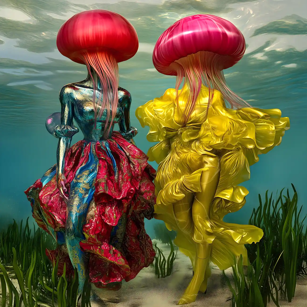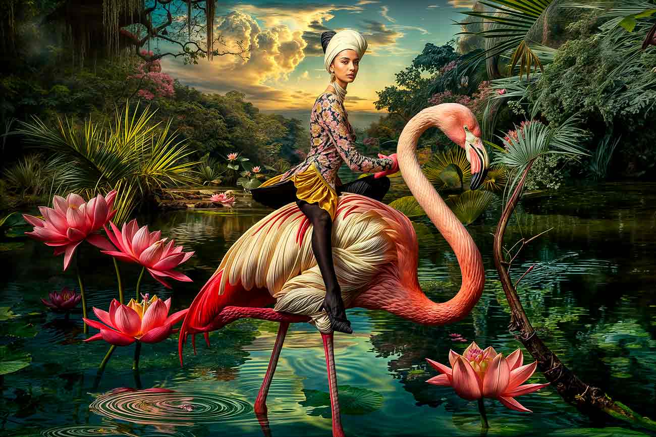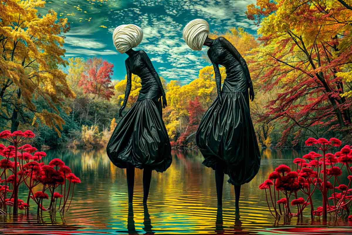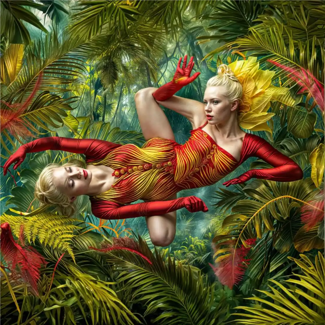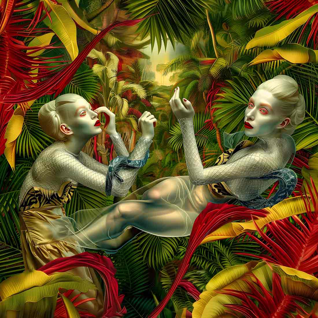 Aquí, la realidad se distorsiona con elegancia. Figuras humanas flotan entre hojas que no existen, visten colores que no obedecen a estaciones, dialogan en silencio con criaturas imposibles.